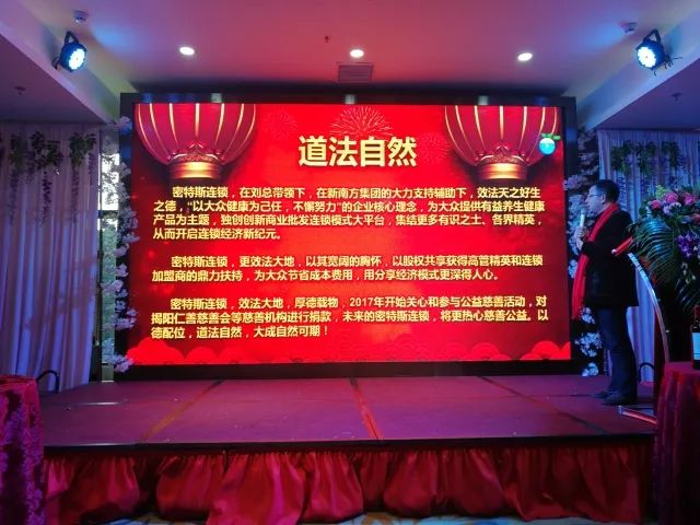 密特斯连锁,在刘总的带领下,新南方集团的大力支持下,效法天之好生之德,以大众健康为己任,不懈努力的企业核心理念,为大众提供 有益养生健康产品为主题,独创创新商业批发连锁模式大平台,以其宽阔的胸怀,以股权共享获得高管精英和连锁加盟商的鼎力支持;2017年,密特斯连锁开始关心和参与公益慈善活动,对揭阳仁善慈善会等慈善机构进行捐款,未来密特斯连锁,将更加热心公益慈善,以德配位,道法自然,大成自然可期!